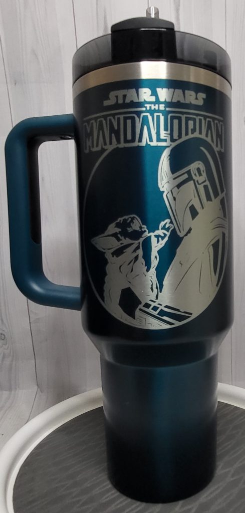 Mandalorian on Stanley tumbler – customer-supplied item – $10 for engraving