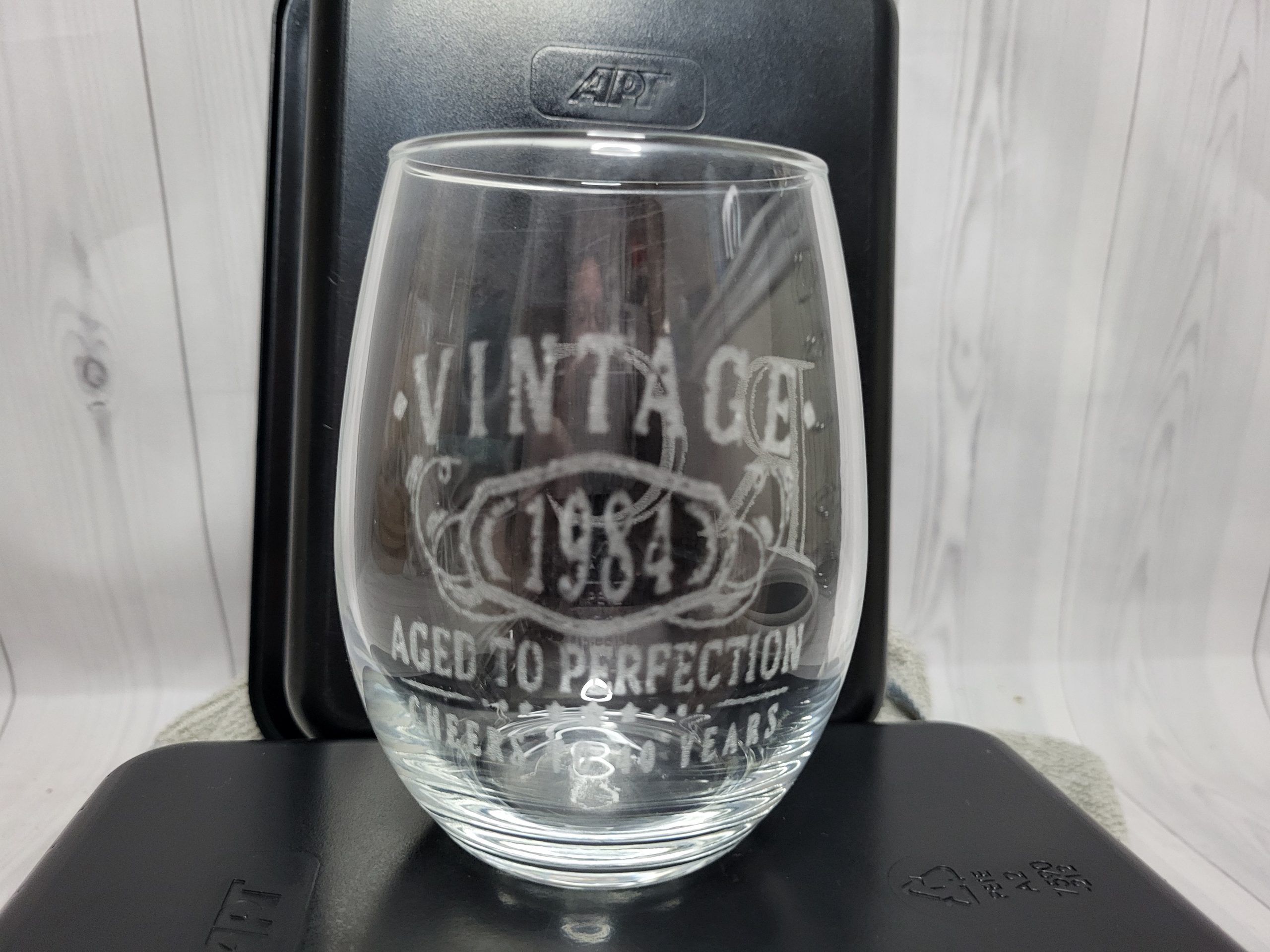 “Vintage 1984” etched on glass – customer-supplied item – $10 for engraving